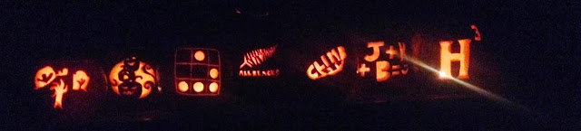 After playing some games and eating more food, we made dinner and started carving pumpkins. By this time it was 8 at night. We didn't finish carving pumpkins until about 10. We were all so tired after. It ended up being a lot of fun. This was the finished product of everyone's pumpkins.